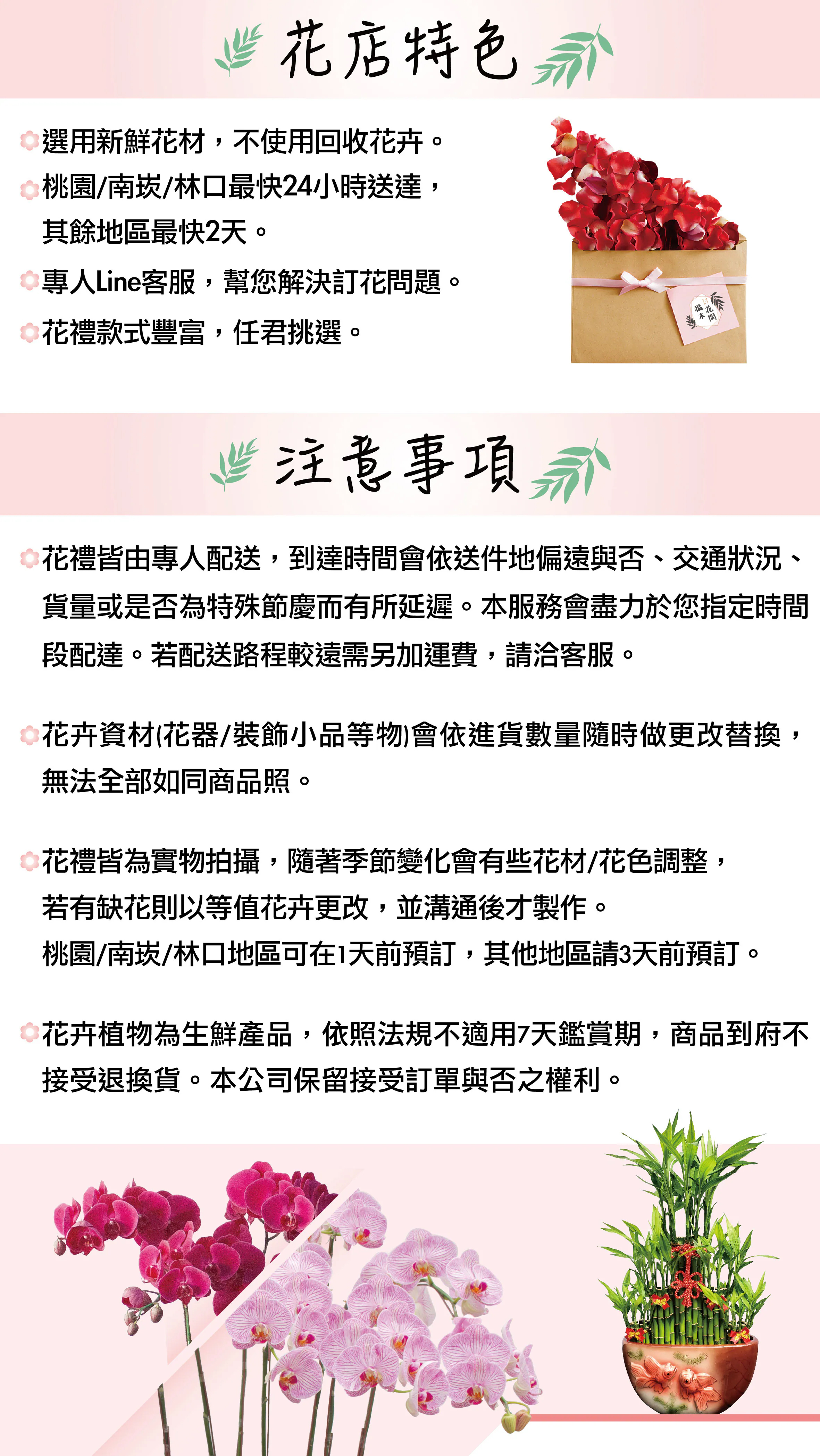 高架花藍類產品, 雙北&桃園地區訂單,基本上需要兩天以上備貨時間; 其他縣市地區訂單,需要更長的備貨時間; 如果需要確認排程, 請詢問LINE客服
